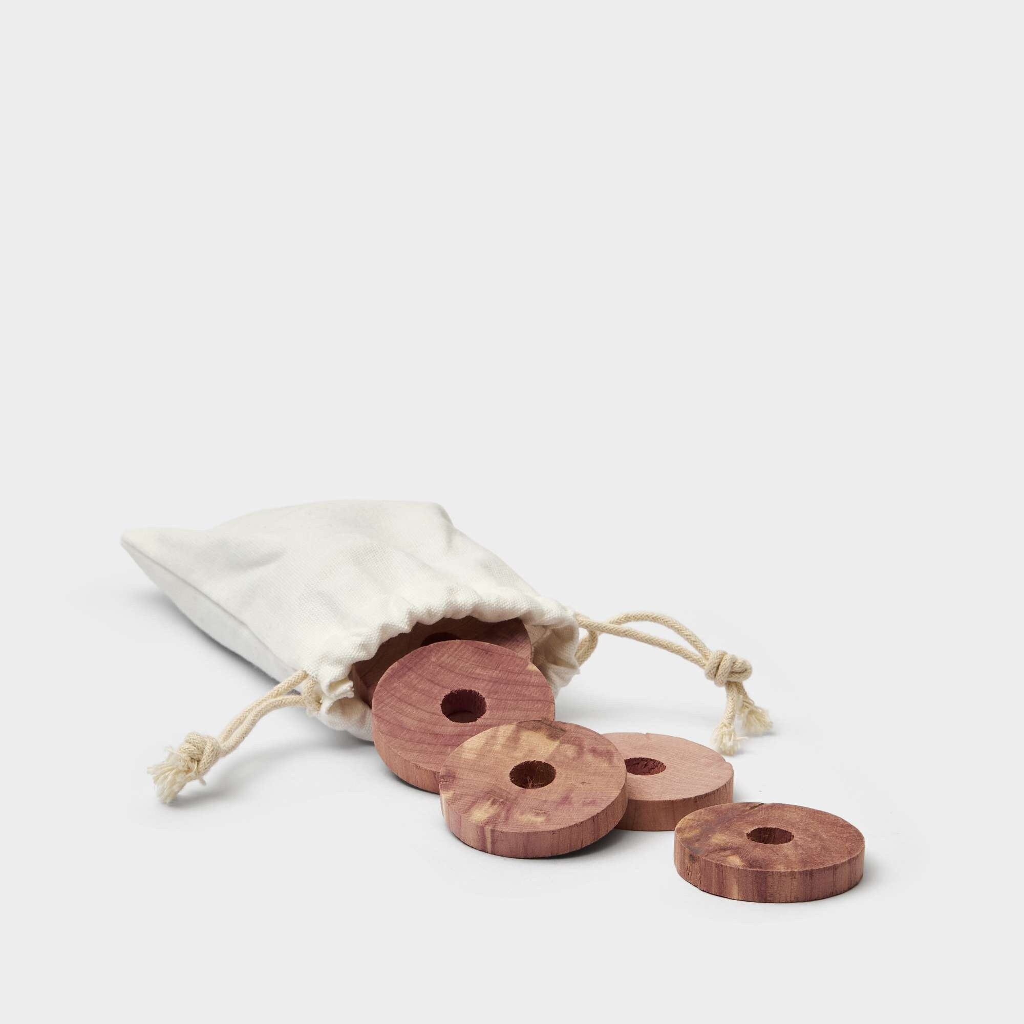 Cederringar fra Iris Hantverk er laget av ubehandlet rødcedertre og leveres i pakke med 10 stk. Rødceder kan brukes til å friske opp klesskapet eller garderoben og fungerer som et naturlig middel mot skadeinsekter.