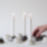 Lysestake i keramikk av Sofie Berg. Lysestakene dreies, poleres og forglødes før de røykbrennes i et oksygenfattig miljø der røyk og sagflis påvirker leirens overflate og skaper levende nyanser.